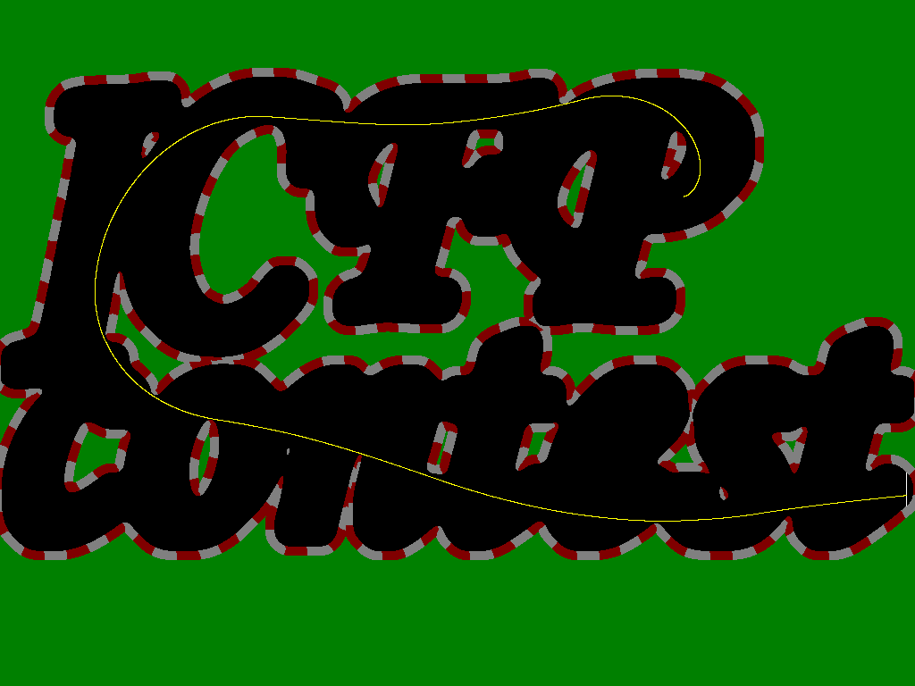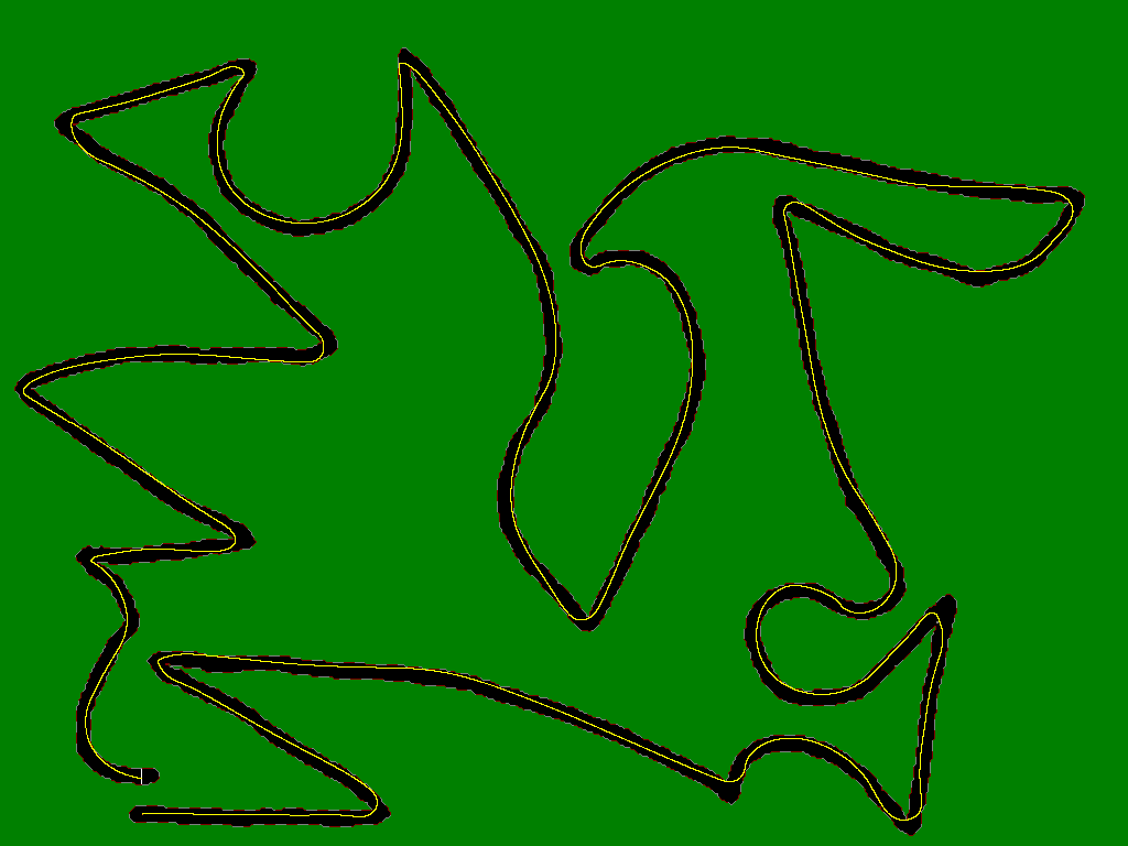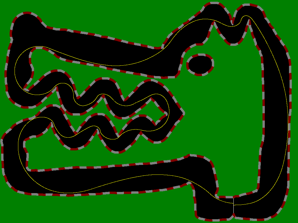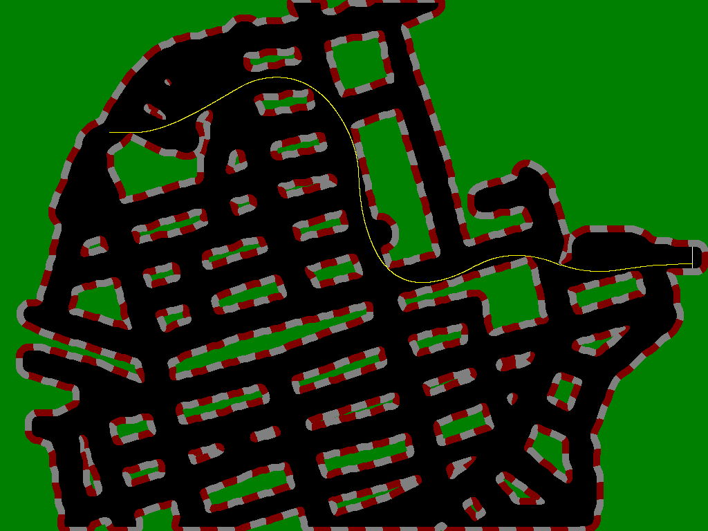 The next task is the internal representation of the track: I choose a simple 2D array with three values: 0 for road, 2 for goal, 1 for the rest. A second array then is computed that contains nearly-euclidean distance to the goal (starting from the left side of the goal, with the goal itself being impassable). I use the same flood-fill approach I used in last year's contest for the robot, modified to pseudo-eclidean coordinates (diagonals are weighted sqrt(2), and there are three arrays for updating; this flood fills the field with an octagonal growing rule).